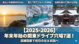 ドライブルート 【2025-2026】年末年始の関東ドライブ穴場7選!混雑回避で初日の出&初詣へ 2025-2026年の年末年始、関東でドライブを楽しむなら穴場がおすすめ!混雑を避けて初日の出が見られる「飯岡刑部岬」や、静寂の「四万温泉」、並ばず参拝できる「天津神明宮」など、厳選スポットと冬の運転対策を紹介します。 2026.01.01 ドライブルート